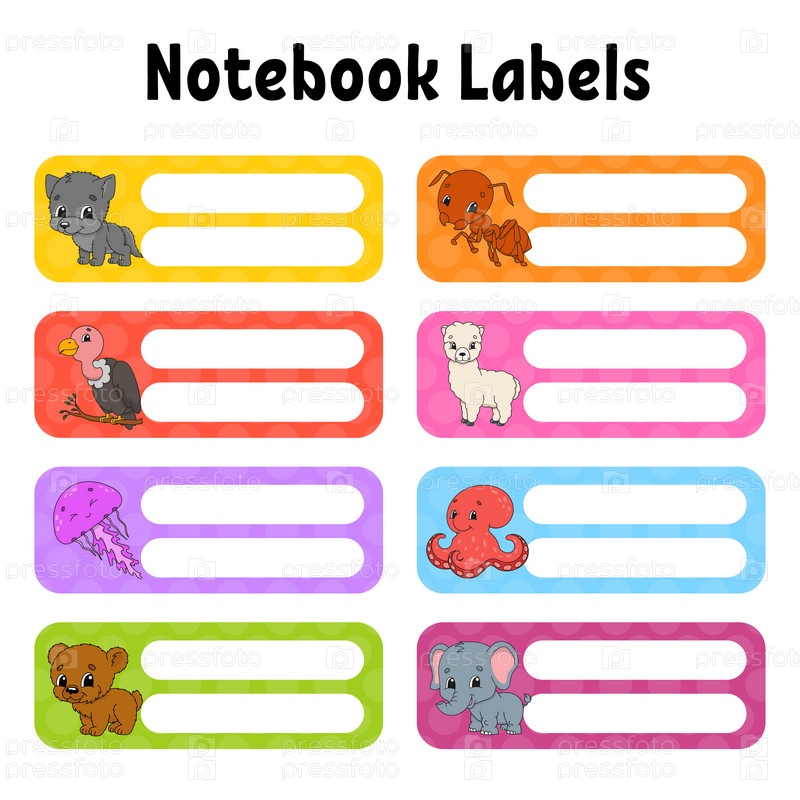 Яркие наклейки. Прямоугольная этикетка. Симпатичные персонажи. Цветовая векторная изолированная иллюстрация