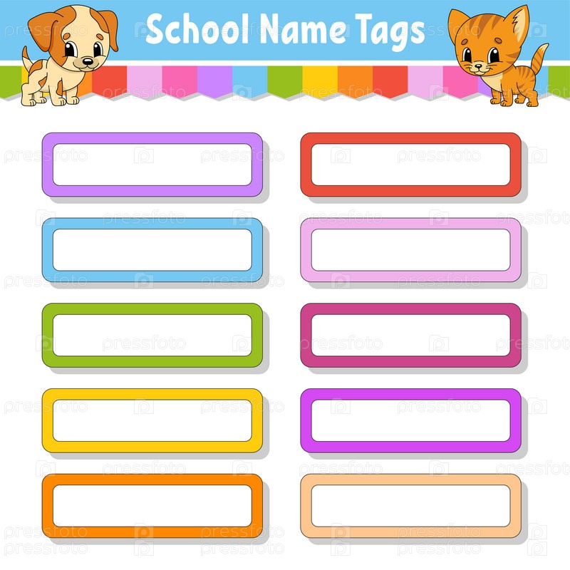 Яркие наклейки. Прямоугольная этикетка. Симпатичные персонажи. Цветовая векторная изолированная иллюстрация