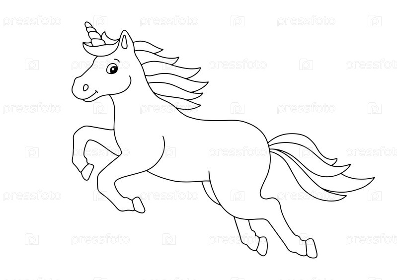 Сказочный прыгающий единорог. Страница раскраски для детей. Персонаж в мультяшном стиле. Векторная иллюстрация изолирована на белом фоне