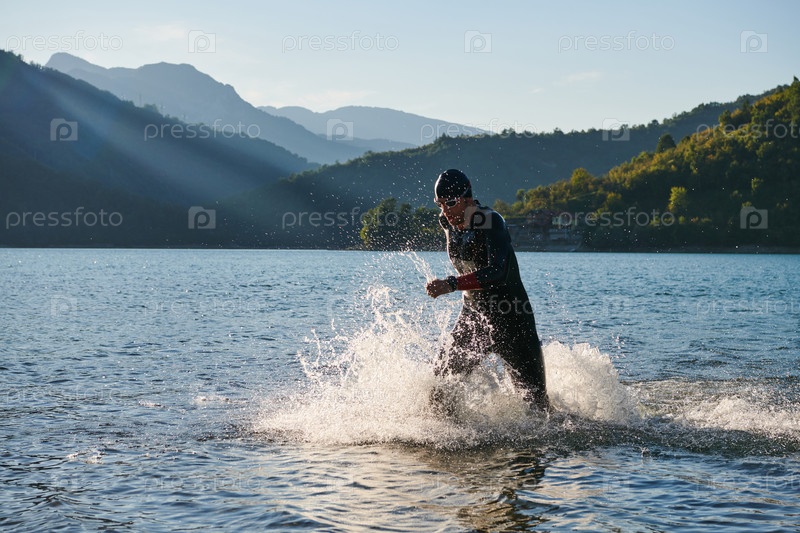 Спортсмен по триатлону начинает тренировку по плаванию на озере