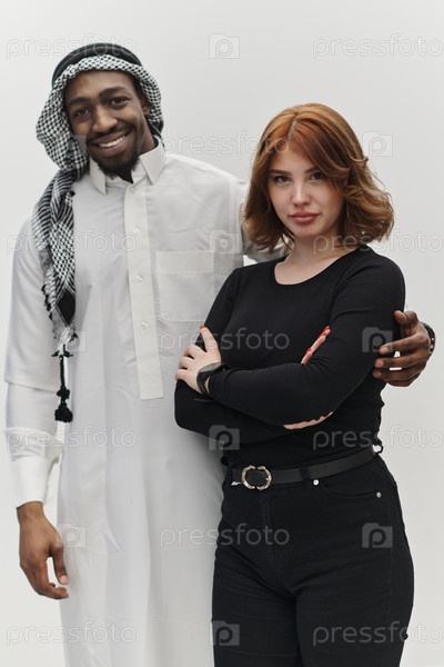 Мусульманский предприниматель и современная рыжеволосая девушка вместе позируют на чистом белом фоне, олицетворяя уверенность, разнообразие и динамичный предпринимательский дух в их партнерстве