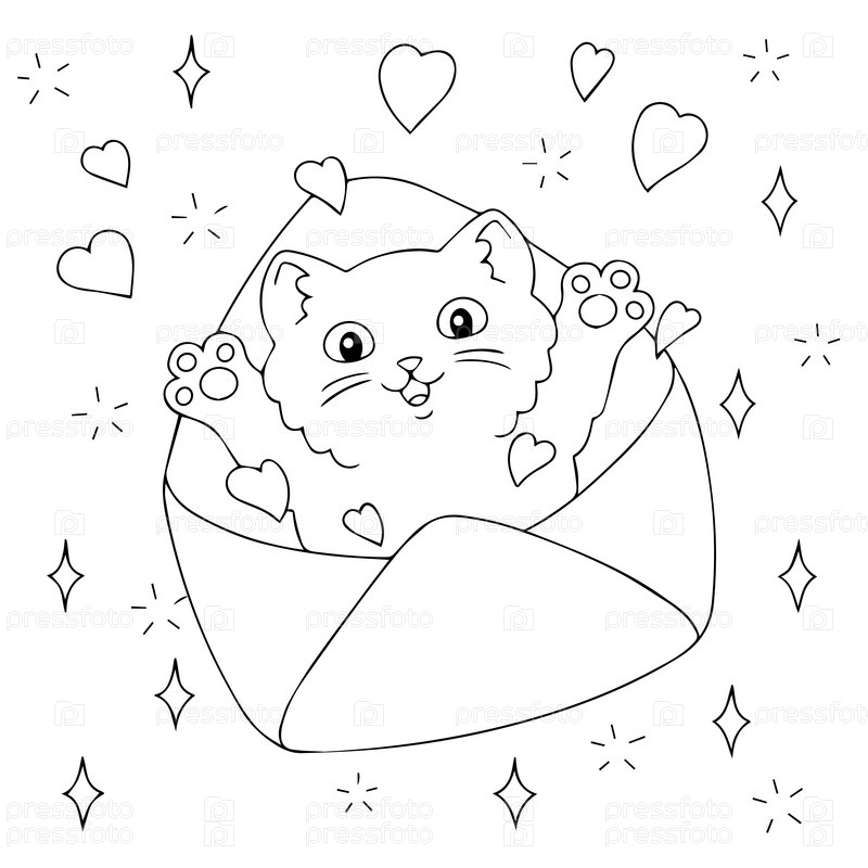 Котенок выпрыгивает из конверта. Страница раскраски для детей. День святого Валентина. Персонаж в мультяшном стиле. Векторная иллюстрация изолирована на белом фоне