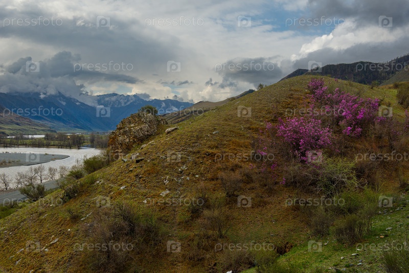 Россия. Юг Западной Сибири, горный Алтай. Панорама весенних гор в долине реки Катунь в районе поселка Инегень
