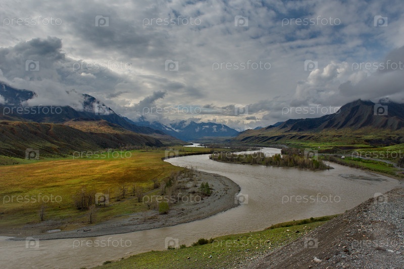 Россия. Юг Западной Сибири, горный Алтай. Панорама весенних гор в долине реки Катунь в районе поселка Инегень