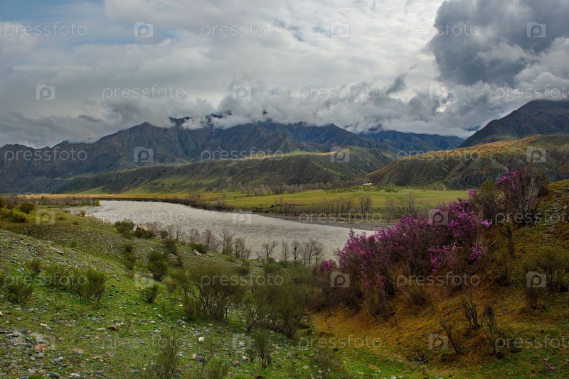 Россия. Юг Западной Сибири, горный Алтай. Панорама весенних гор в долине реки Катунь в районе поселка Инегень