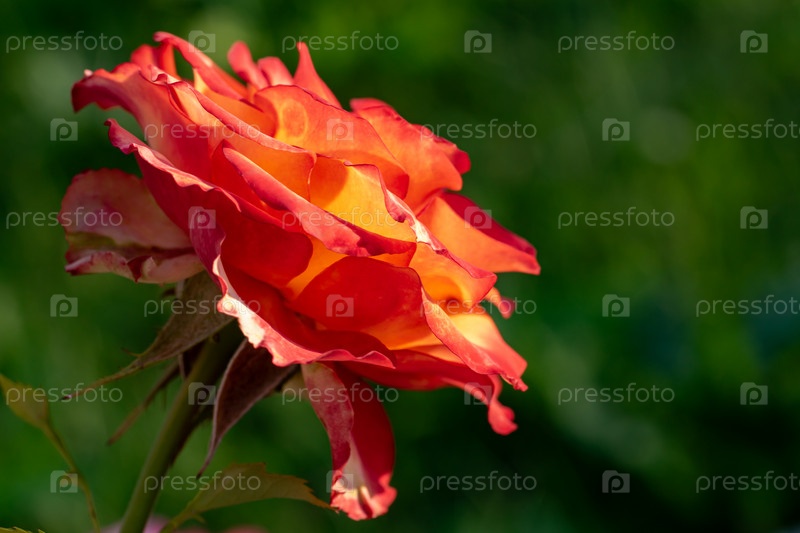 Одна цветущая красная роза в саду в солнечный летний день, цветочный фон