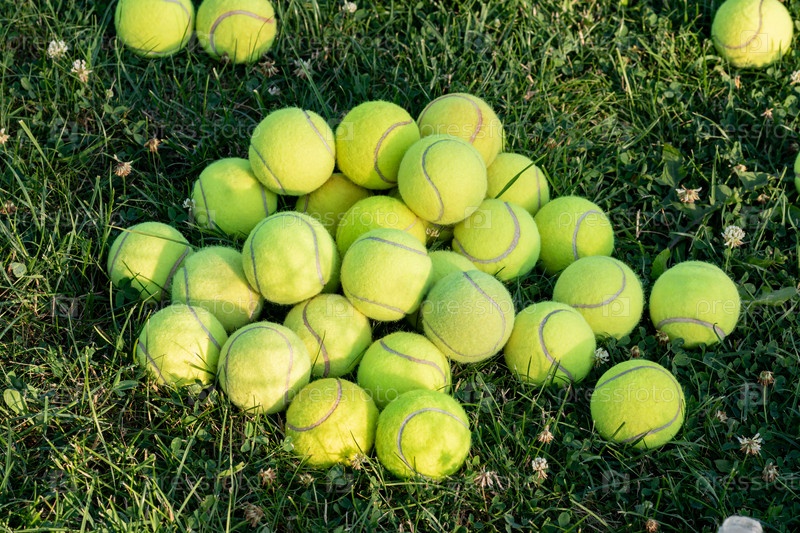 Куча теннисных мячей на зеленой траве. Мячи для популярных спортивных игр, аксессуар для соревнований