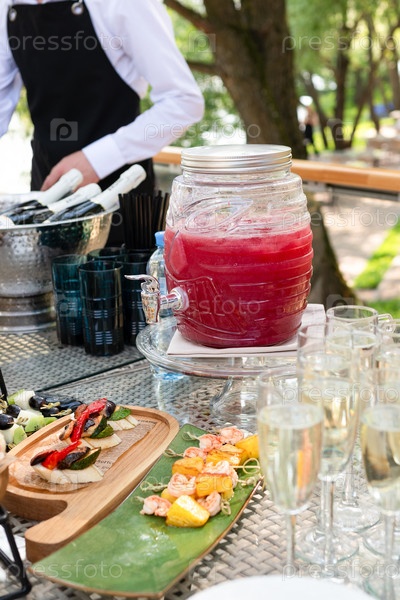 На праздничном столе представлены разнообразные свежие фрукты, напитки и закуски. Официант наливает фруктовый пунш. Также присутствуют тарелки с едой и шашлычки из креветок и овощей