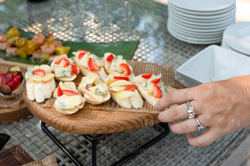 Деревянная тарелка с разнообразными закусками с клубникой, сыром и хлебом на столе с белой скатертью. Видны другие тарелки и стаканы. Размытый фон ресторана