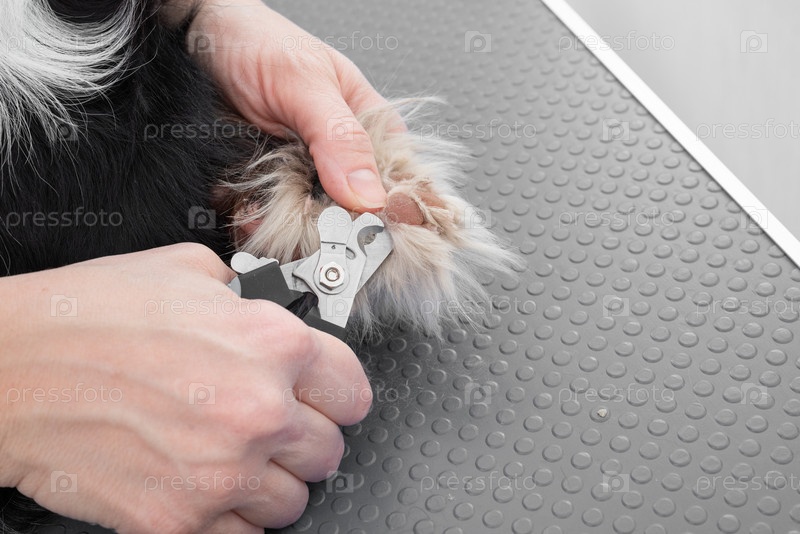Грумер для домашних животных подстригает когти собаки на противоскользящем коврике для безопасного ухода