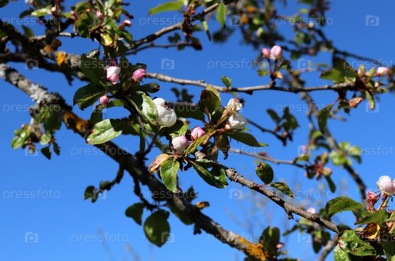 Ветвь яблони с розовыми бутонами на фоне голубого неба