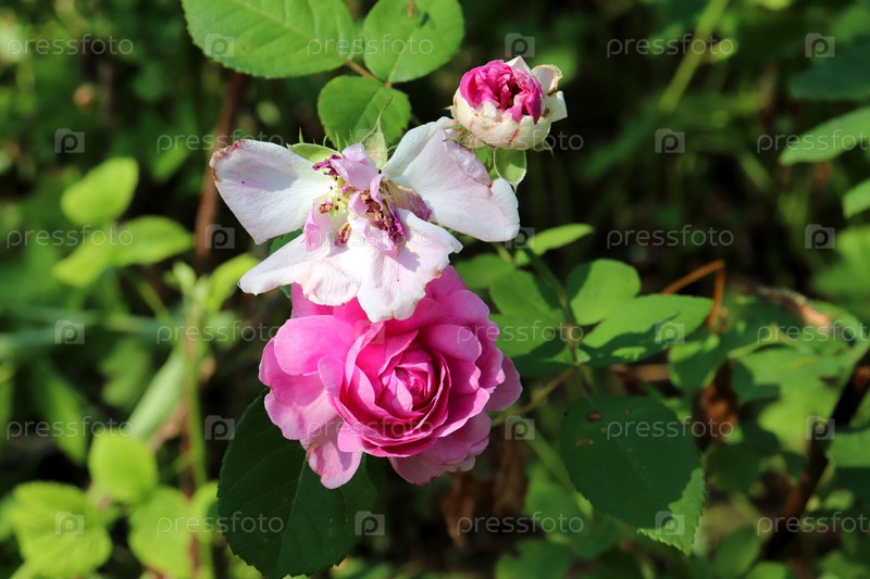 Розовая пионовидная роза с увядшим цветком на кусте в солнечный день