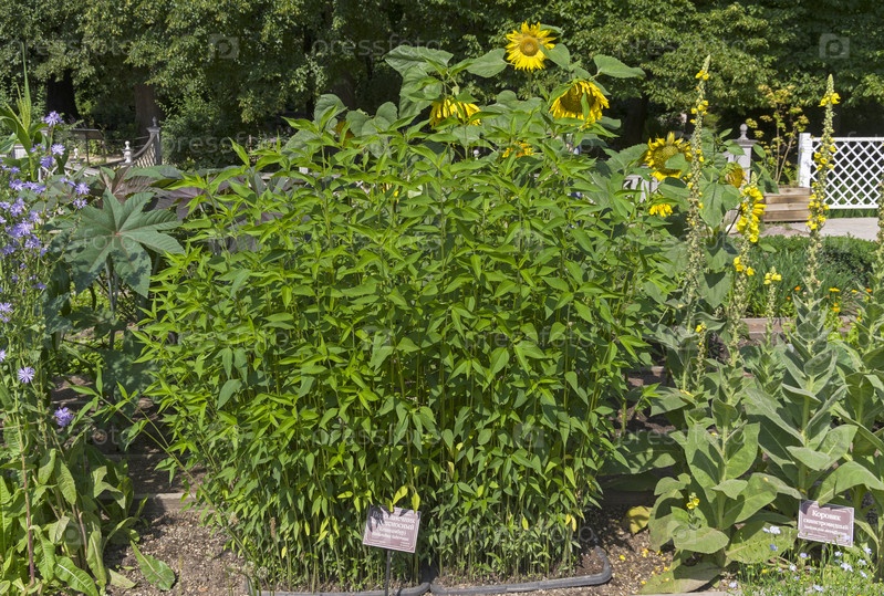 Топинамбур (лат. Helianthus tuberosus) на кровати с лекарственными растениями в Аптекарском саду (филиал ботанического сада МГУ).Москва.Июль, солнечный