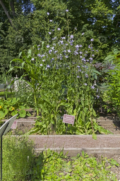 Цветение обыкновенного цикория (lat.Cichorium intybus) на кровати с лекарственными растениями в Аптекарском саду (филиал ботанического сада МГУ).Москва.Июль, солнечный