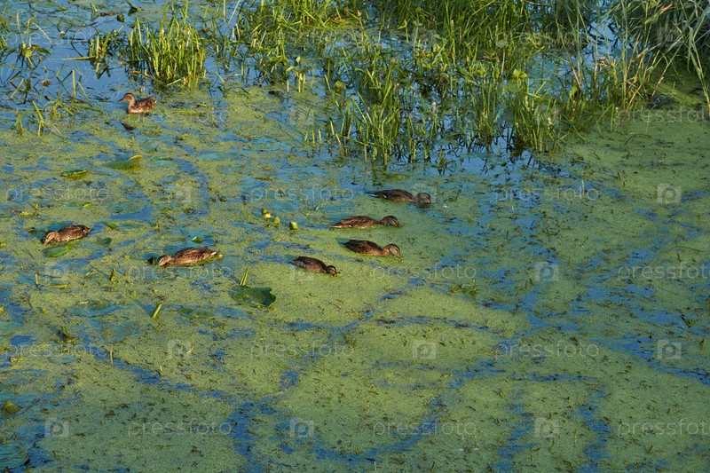 Кряква и утята. Семья уток кормится среди кувшинок на реке