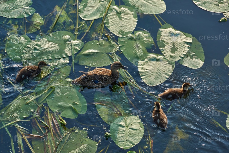 Кряква и утята. Семья уток кормится среди кувшинок на реке