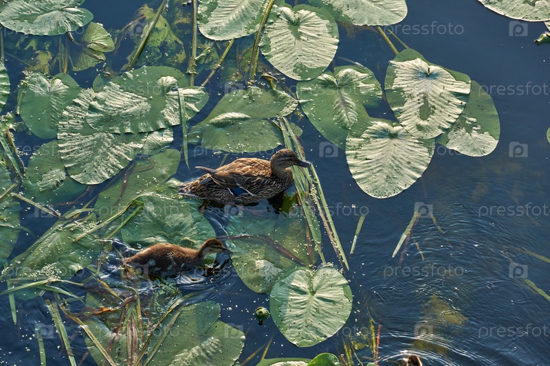 Кряква и утята. Семья уток кормится среди кувшинок на реке