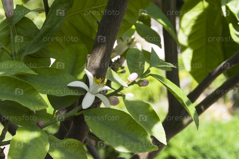 Цветение лимона (лат. Citrus limon) в Аптекарском саду (филиал ботанического сада МГУ). Москва. июль, солнечный