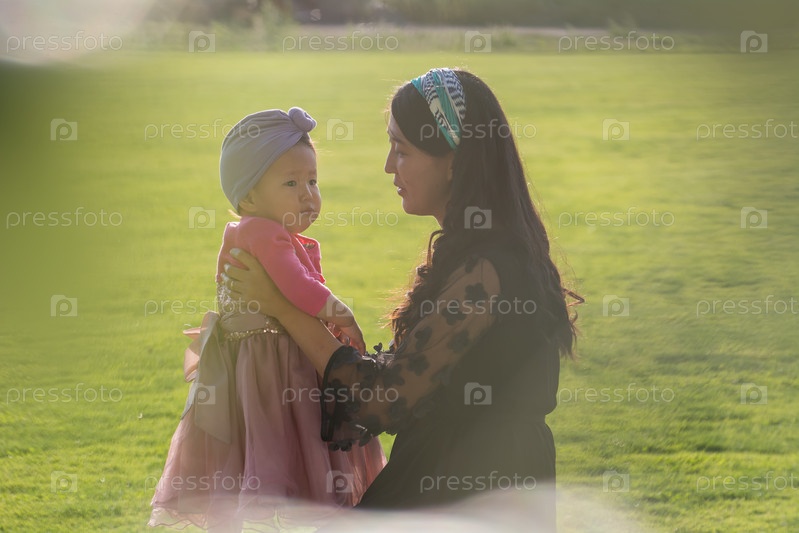 Молодая мать с дочерью на фоне зеленой лужайки. Девушка с маленькой девочкой обнимаются и улыбаются. Боке и размытие переднего плана