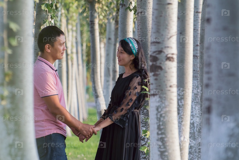 Молодая пара, парень и девушка обнимаются, держатся за руки. Муж и жена гуляют в парке среди деревьев