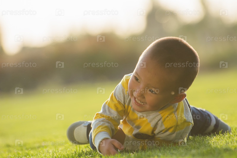 Шестилетний азиатский мальчик лежит на зеленой траве спиной и смотрит в объектив камеры, ребенок на футбольном поле в лучах заката. избирательный фокус
