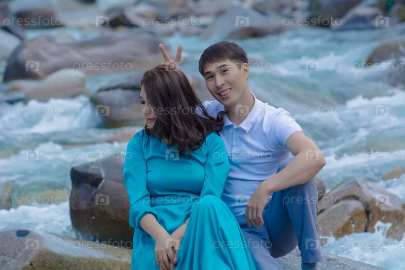 Молодожены, жених и невеста на свадьбе возле пруда
