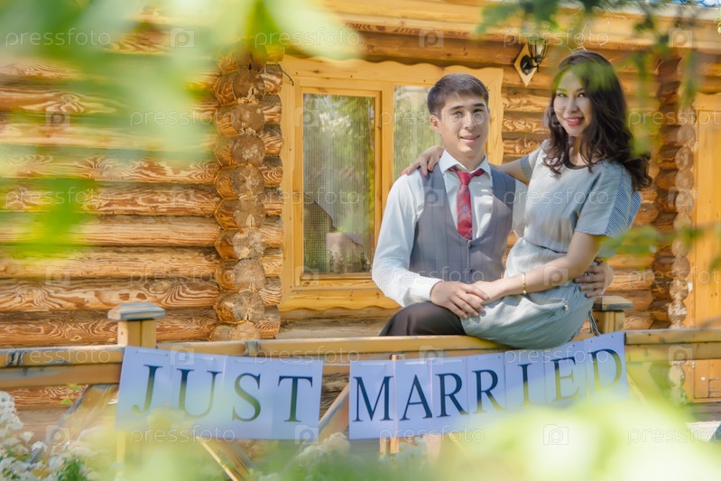 Парень и девушка азиатской национальности кыргызы на природе, на фоне гор. держат табличку, баннер молодожены, молодожены