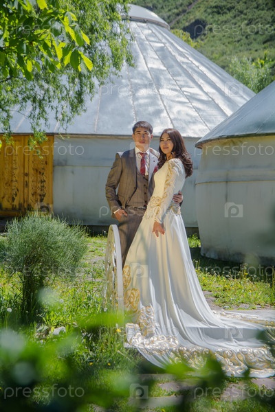 Жених и невеста в национальном свадебном платье с азиатским киргизским орнаментом на природе на фоне юрты