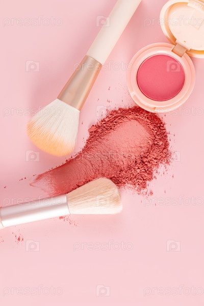 Открытая упаковка розовых румян, образец текстуры румян и две кисти для макияжа на розовом вертикальном фоне. вид сверху