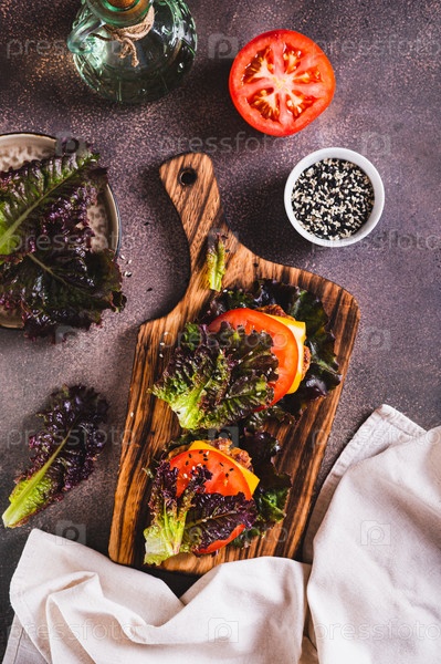 Сочные кето-бургеры на свежих листьях салата с котлетой, помидорами и сыром сверху и вертикальный вид