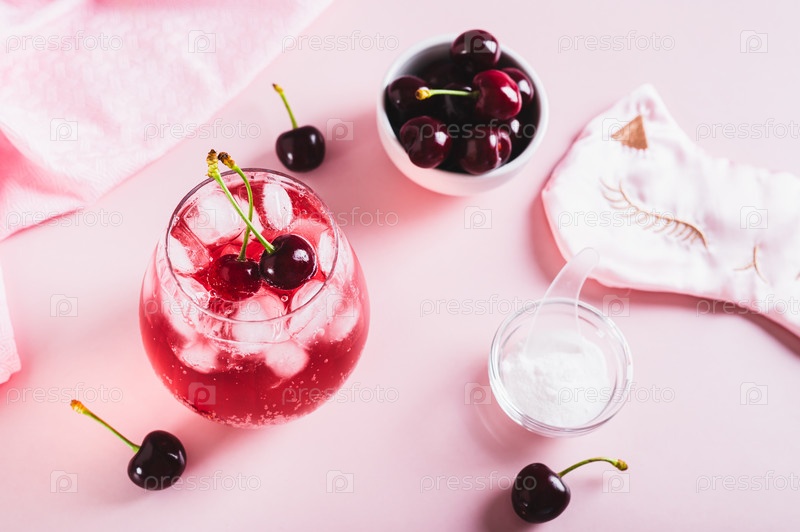 Сонная девушка-коктейль с магнием и вишневым соком в стакане на столе