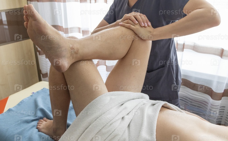 Женщина-мануальный терапевт проводит физиотерапию у пациента мужского пола среднего возраста. Здравоохранение