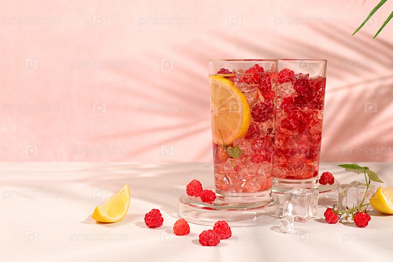 Детокс-вода с фруктовым вкусом на светлом фоне. Освежающий летний домашний лимонадный коктейль, мохито с малиной, смородиной, мятой и лимоном, концепция похудения, здоровая и натуральная еда, избирательный фокус