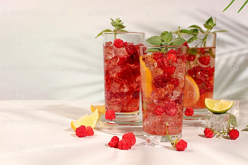 Освежающий летний домашний лимонадный коктейль, мохито с малиной, смородиной, мятой и лимоном, детокс-вода с фруктовым вкусом, концепция похудения, здоровая и натуральная еда,