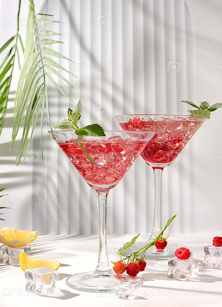 Лимонадный коктейль с текилой, джином, ромом, водкой, ликером, лаймом, льдом и свежей малиной, концепция бара и вечеринки, рекламная карточка ресторана и кафе, элегантный фон с тенями,