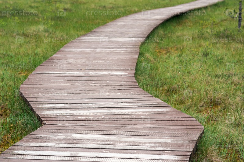 Деревянная дорожка на образовательной природной тропе в охраняемом торфяном болоте