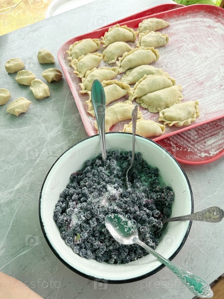 Готовим пельмени с черникой. Черника в миске. Пельмени выкладываются на противень