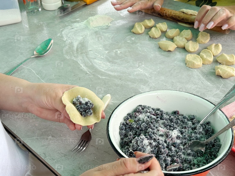 Женщины готовят пельмени с черникой. Раскатанное тесто начиняем ягодами. Другой раскатывает тесто