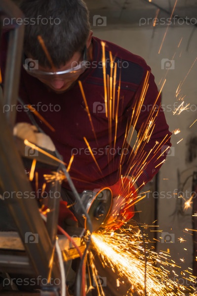 Мужчина пилит металл болгаркой, и вылетает много искр