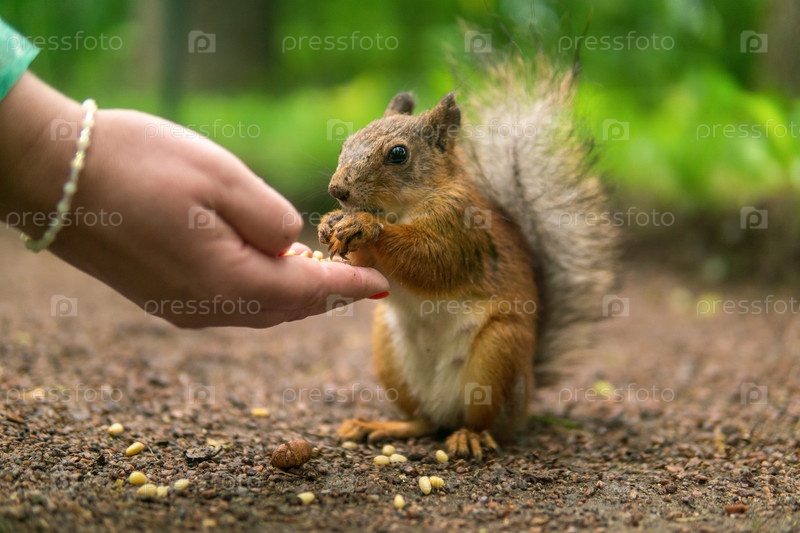 Дикая белка в парке ест с женской ладони в парке