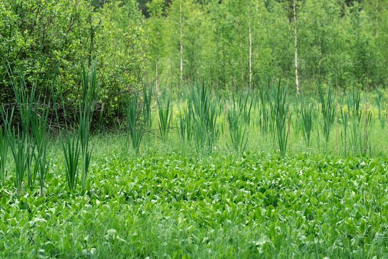 Зеленый болото с осокой и болотной фасолью в лесу