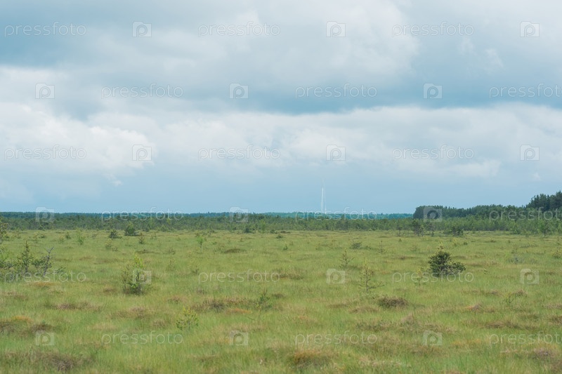 Пейзаж торфяной топи с городом на горизонте