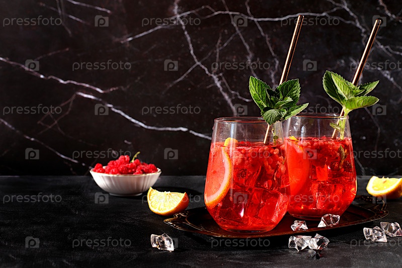 Лимонадный коктейль с текилой, джином, ромом, водкой, ликером, лаймом, льдом и свежей малиной, концепция бара и вечеринки, рекламная карточка ресторана и кафе, черный фон, выборочный фокус