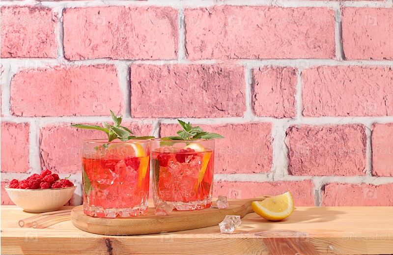 Лимонадный коктейль, мохито с текилой, джином, ромом, водкой, ликером, лаймом, льдом и свежей малиной, концепция бара и вечеринки, рекламная карточка ресторана и кафе, черный фон, избирательный фокус