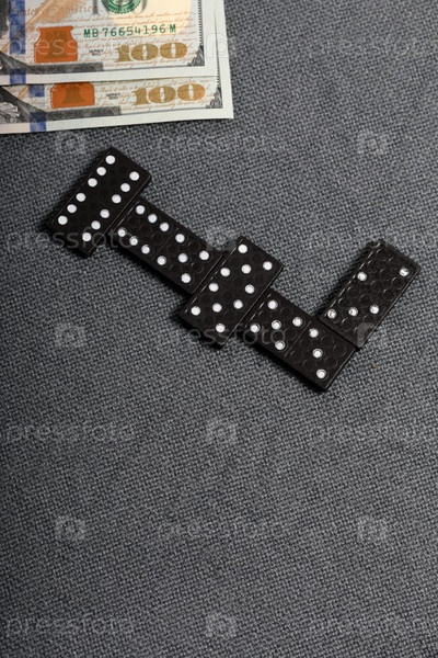 Домино костяшками пальцев лежит на поверхности, покрытой грубой серой тканью. Рядом лежат двухсотдолларовые купюры