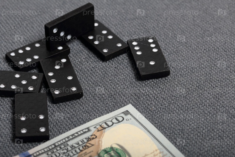 Домино костяшками пальцев лежит на поверхности, покрытой грубой серой тканью. Рядом лежит стодолларовая купюра