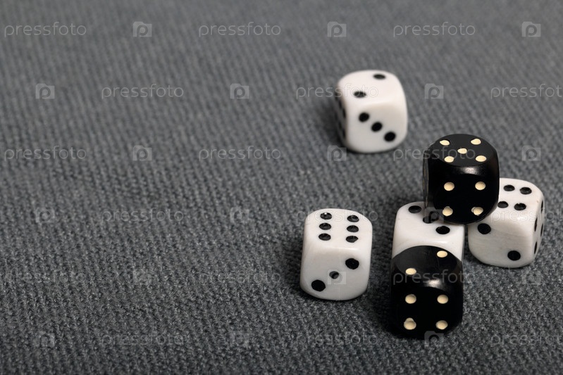 Белые игральные кости с черными отметинами. Они лежат на поверхности, покрытой грубой серой тканью. Среди них два черных кубика с белыми отметинами