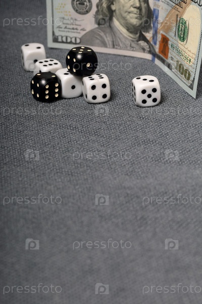 Белые игральные кости с черными отметинами. Они лежат на поверхности, покрытой грубой серой тканью. Среди них два черных кубика с белыми отметинами. Рядом лежит стодолларовая купюра