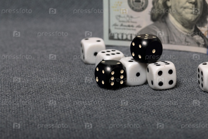 Белые игральные кости с черными отметинами. Они лежат на поверхности, покрытой грубой серой тканью. Среди них два черных кубика с белыми отметинами. Рядом лежит стодолларовая купюра