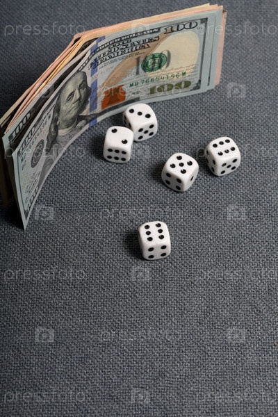 Белые игральные кости с черными отметинами. Они лежат на поверхности, покрытой грубой серой тканью. Рядом лежат несколько долларовых купюр разного достоинства